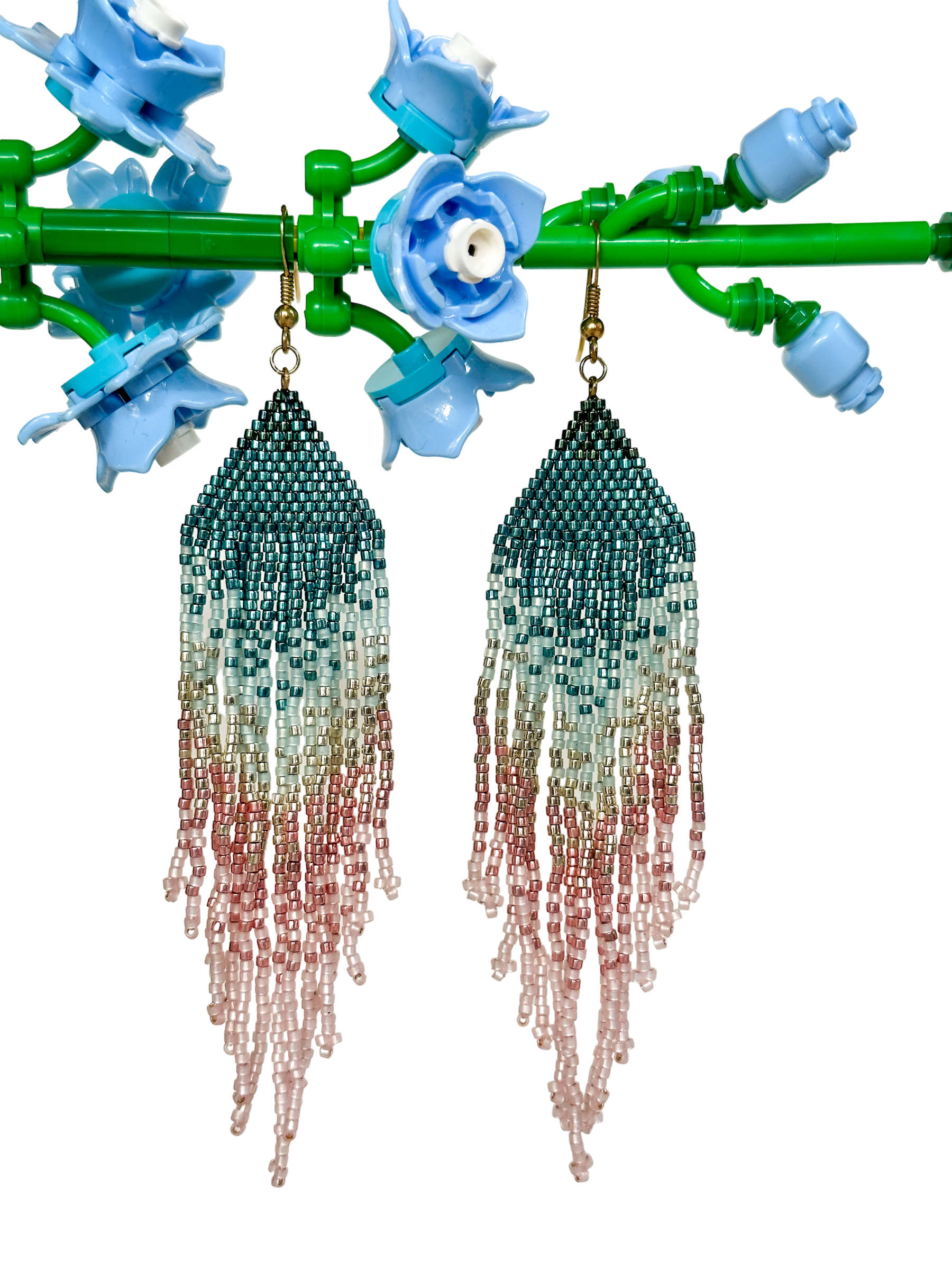 The earrings are made of high-quality glass beads (574 beads per earring) and have a gold-plated 925 silver ear hook.