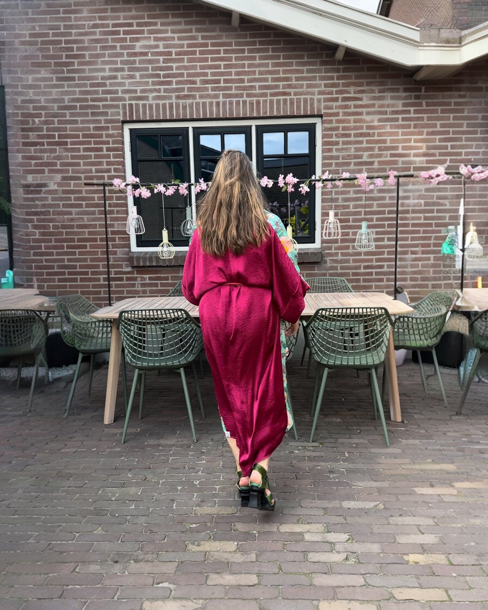 The front is in a beautiful colorful flower pattern, printed on the delicious Lenzing Ecovero! The back is made of beautiful micro satin. This kaftan feels wonderfully soft and subtly shines with a light sheen. This inclusive design offers the flexibility to be worn with or without a belt, allowing you to experiment with style and comfort.