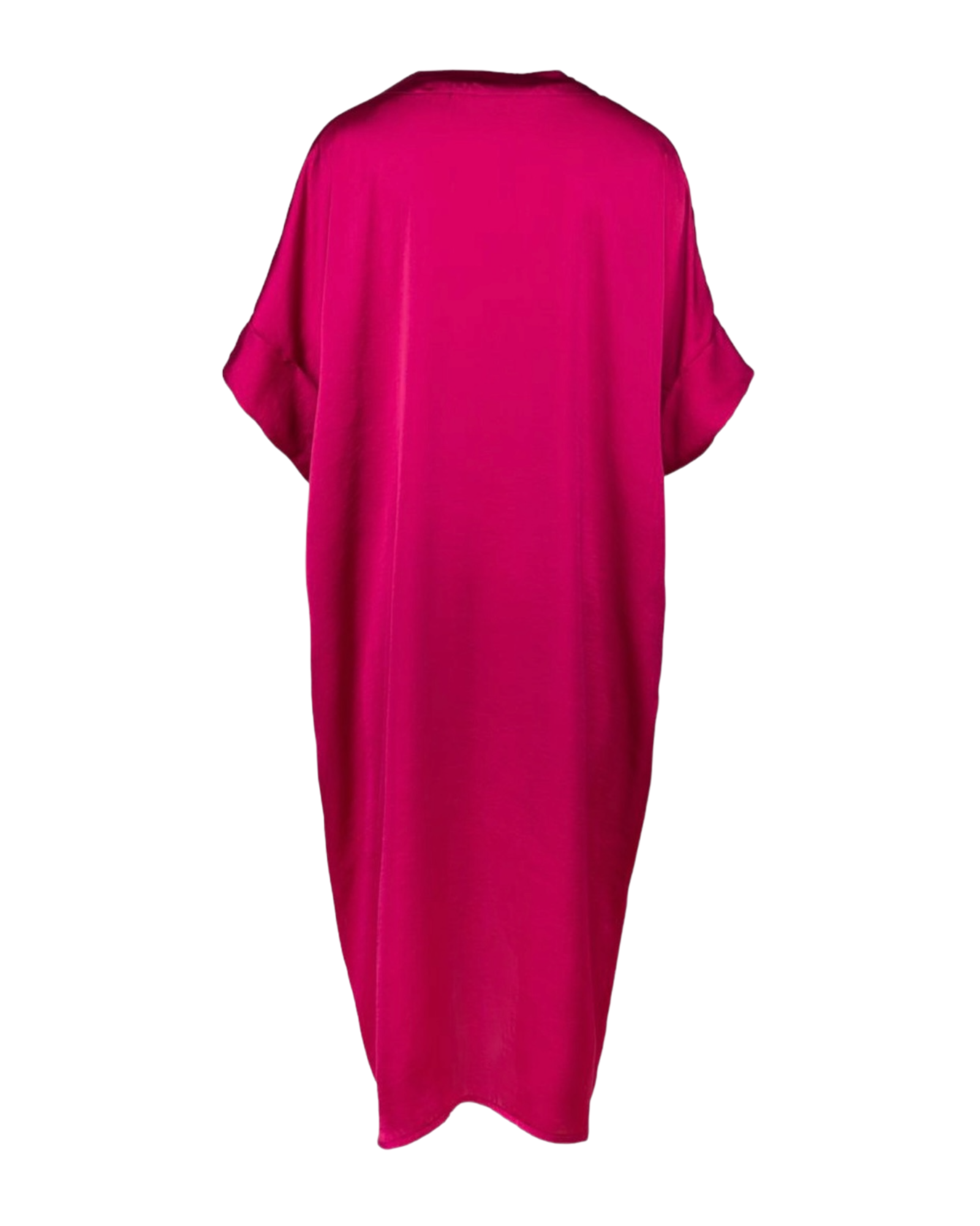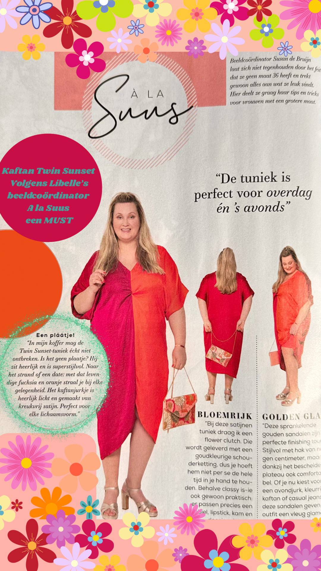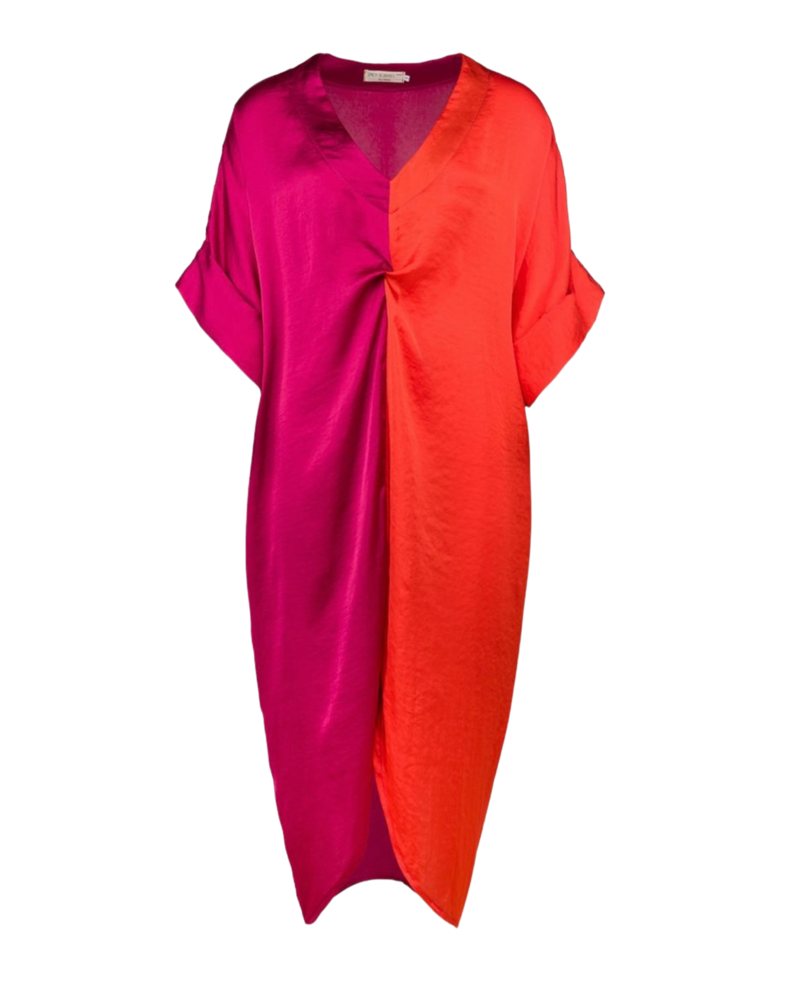 The Twin Sunset kaftan is made of beautiful satin in the colors fuchsia and orange. This fabric is cool and does not show. Worn loose with sandals or with killer heals and a belt to give shape, this colorful dress is comfy elegant and you wear it from day to night.