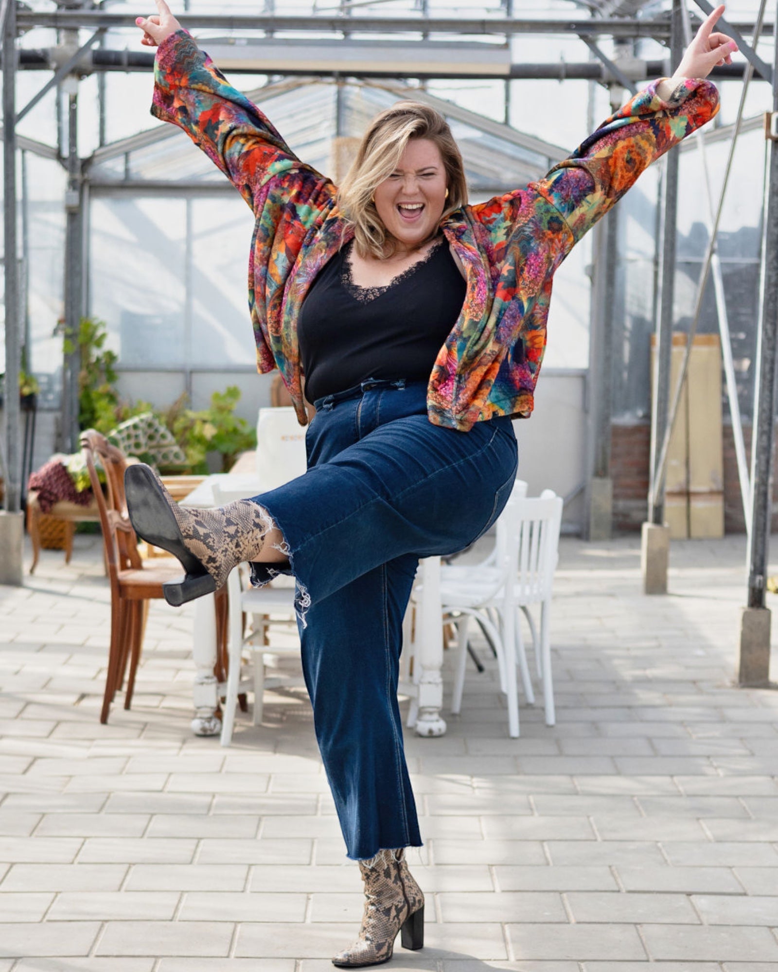 The Vibrant Spice kimono jacket comes in 3 sizes (size 34 - 36 size 38 - 44 and size 46-50) and is wonderfully airy, even on warm days. The perfect jacket to give your wardrobe a colorful boost. This versatile jacket can be styled and combined endlessly. From jeans to an elegant dress, indoors and outdoors.