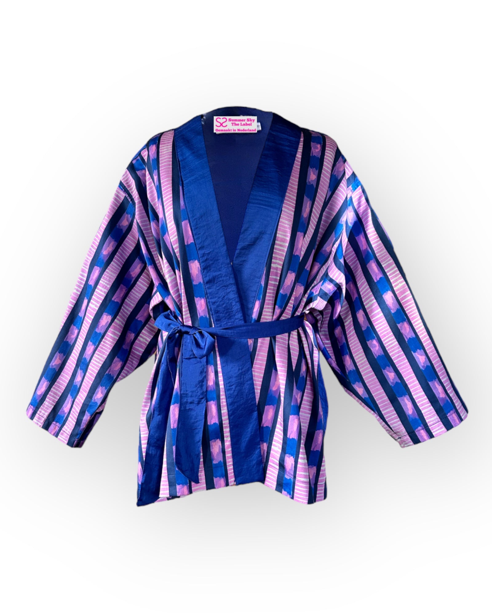 Enhance your style with our stunning kimono, draped in the same beautiful print as our skirts and top in this amazingly colourful palette. The back panel, lapel and tie belt are made of strong cobalt satin, giving this kimono an elegant and chic look. Whether you have a special occasion or just want to dress yourself up every day, this kimono is your friend for every occasion.