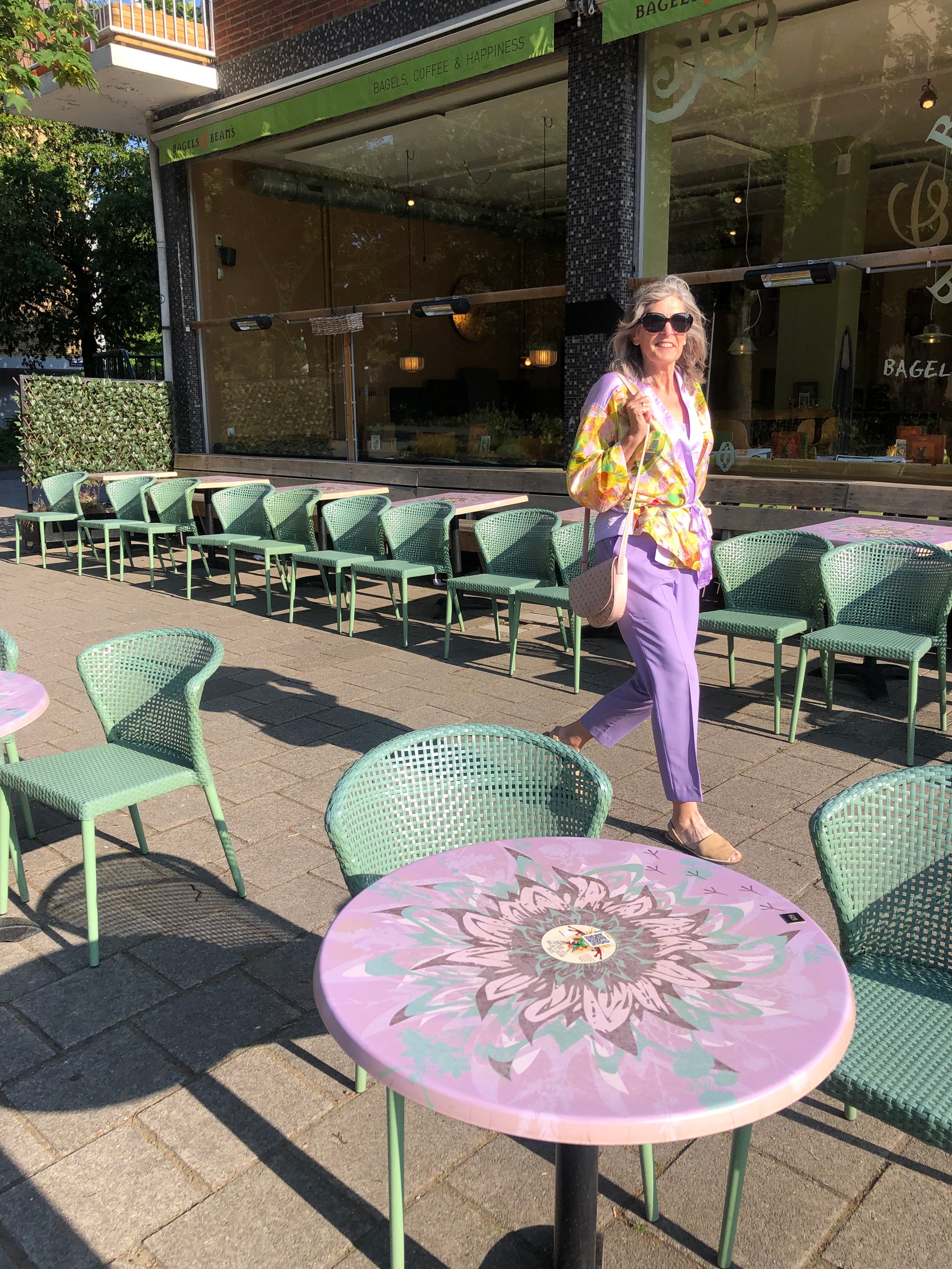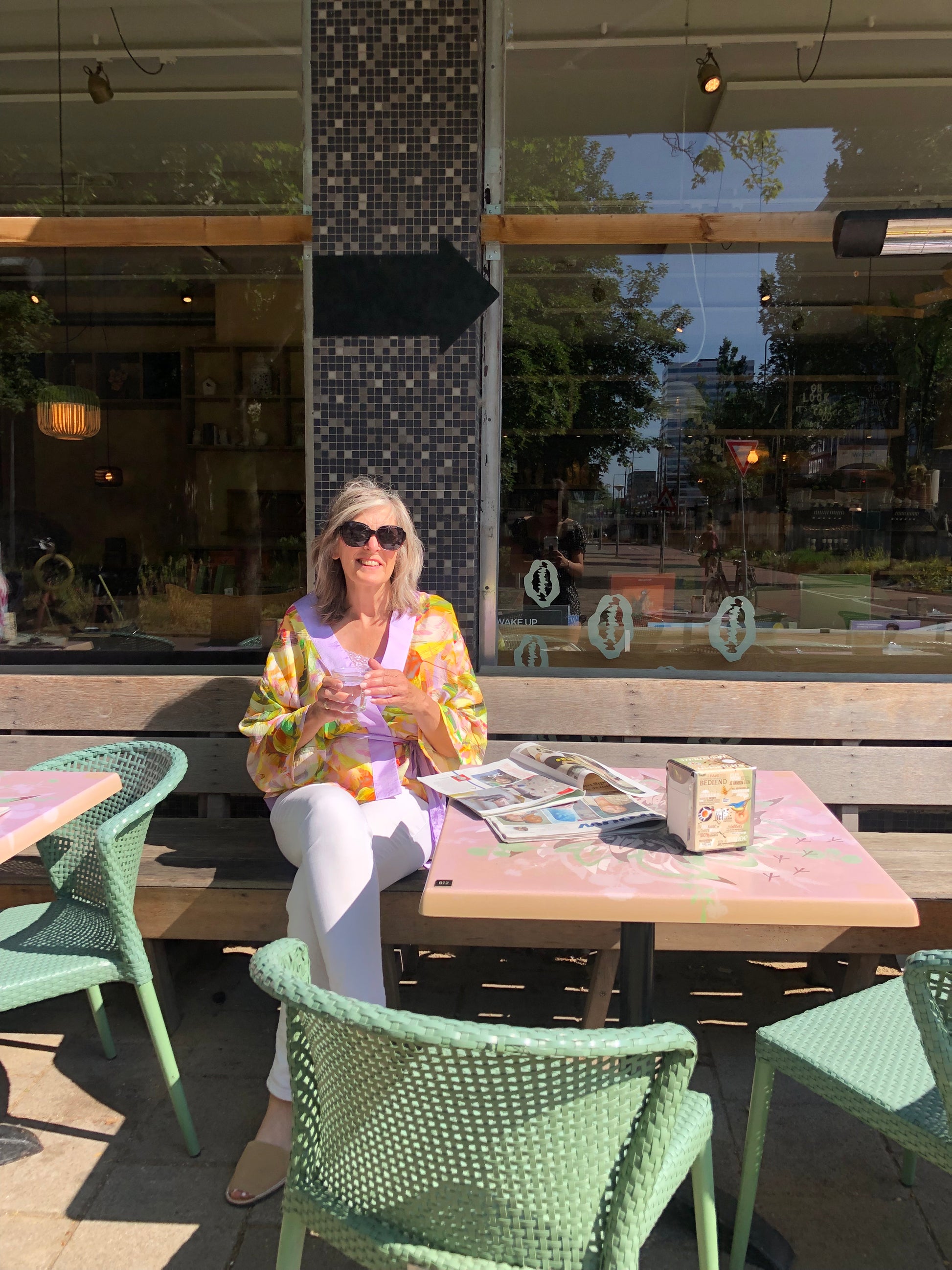 Elegant en veelzijdig, de kimono Leaf Cocktail. De unieke print van verfstreken en bladeren in zachte tinten met een gele hoofdtoon en het contrast met het lila achterpand, rever en ceintuur maakt deze kimono een echte eyecatcher. Draag hem met ceintuur voor een getailleerde look of los voor een casual uitstraling. Geschikt voor maat 34 t/m 50 dankzij de ruime maatvoering. Perfect als chique ochtendjas of modieuze toevoeging aan je outfit.