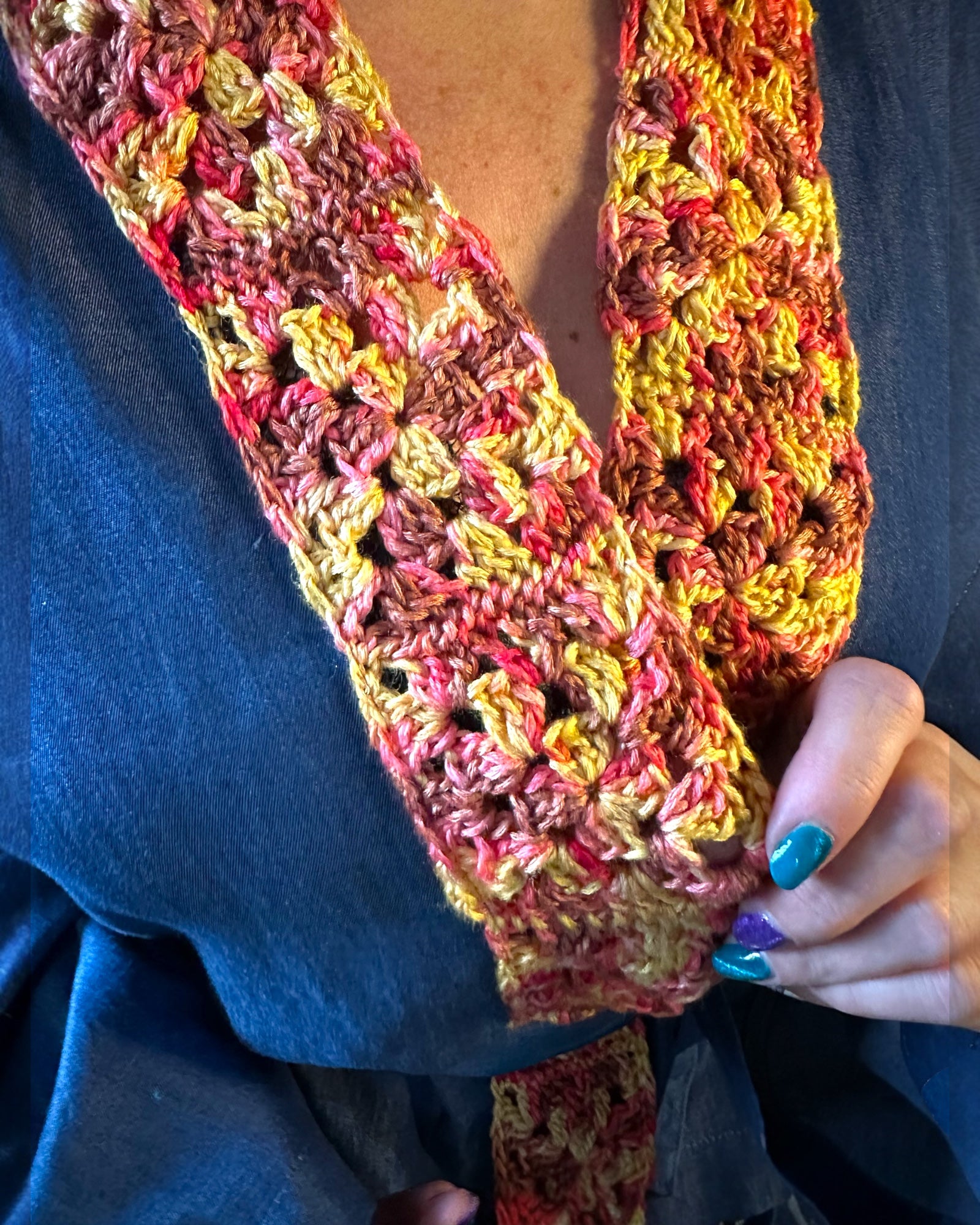 Wat deze kimono echt bijzonder maakt, is het stijlvolle revers dat is gehaakt met 100% zeewier garen welke hand geverfd worden in Nederland, hoe gaaf is dat?! De granny squares zijn met de hand vervaardigd (want er bestaat geen haak machine😉) en hebben een prachtig degradé in zonsopgangkleuren, wat elke kimono een uniek karakter geeft. Het gebruik van zeewier garen benadrukt niet alleen onze toewijding aan duurzaamheid, maar voegt ook een natuurlijke luxe toe aan je outfit.