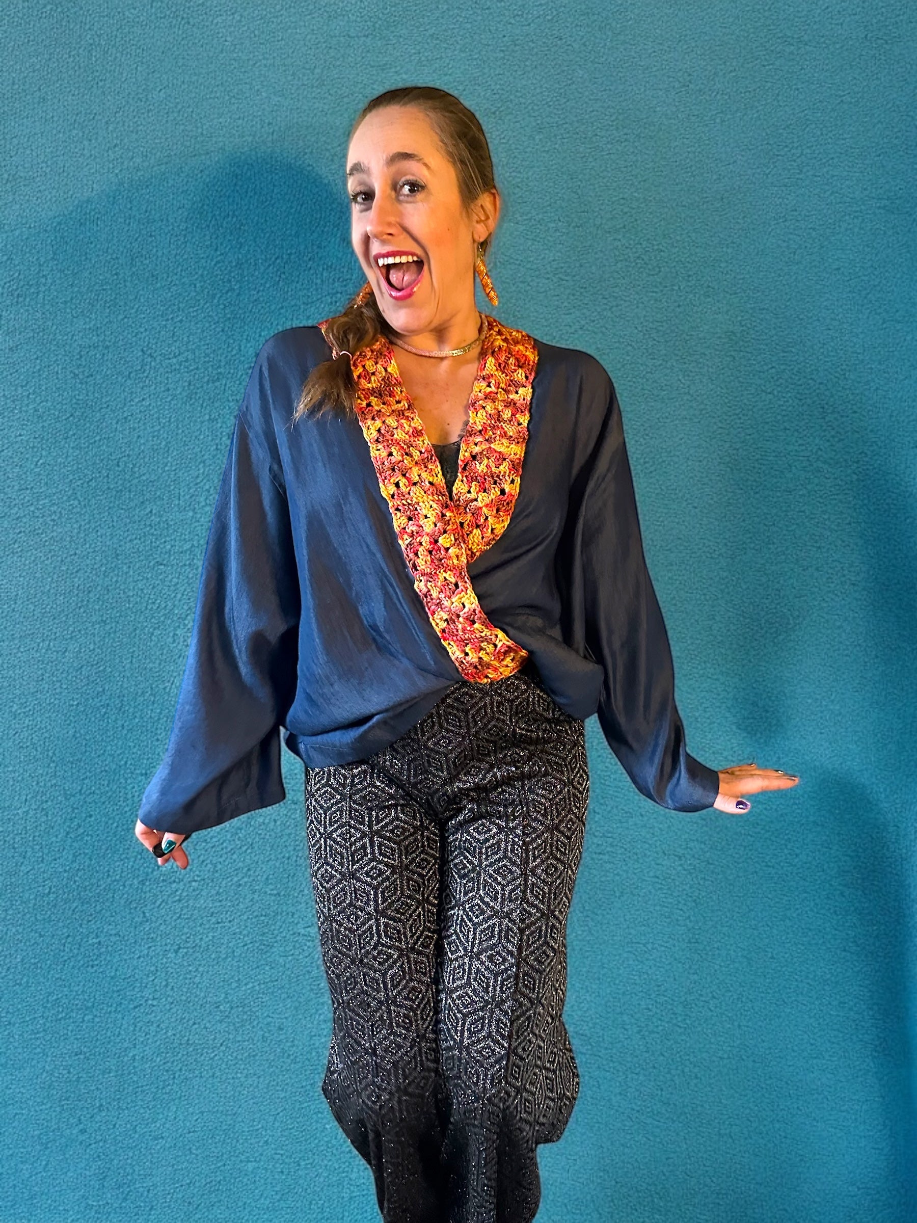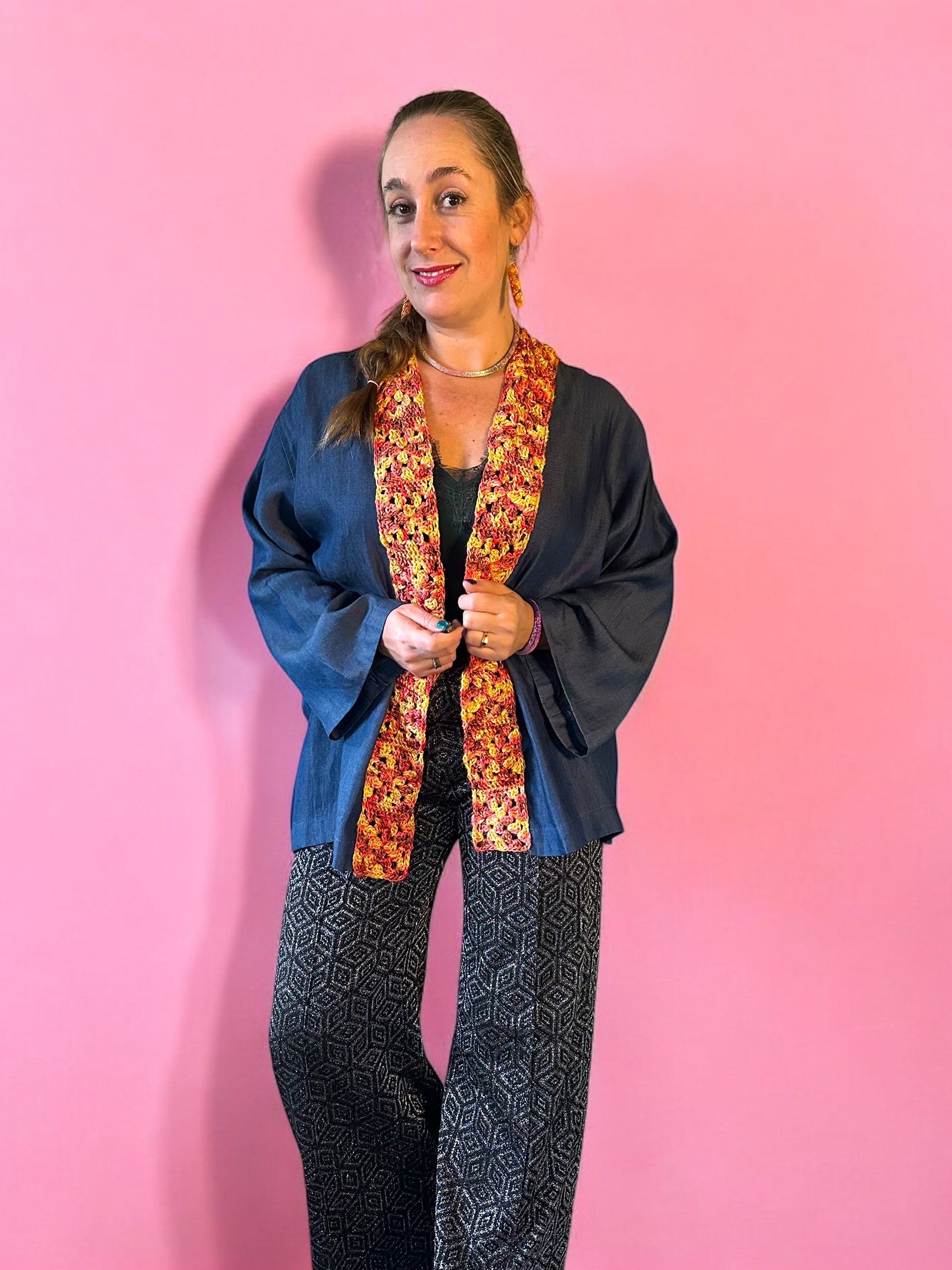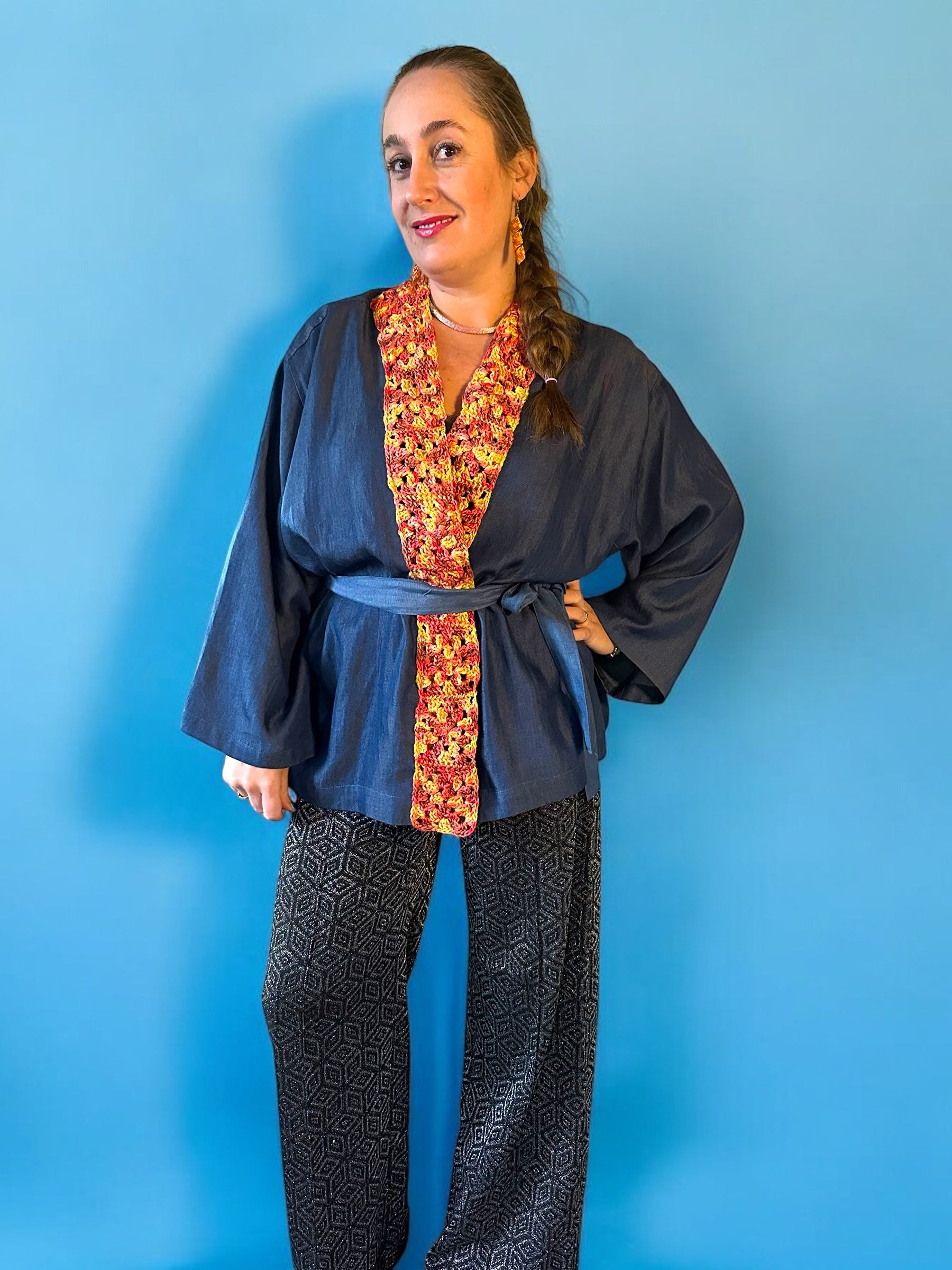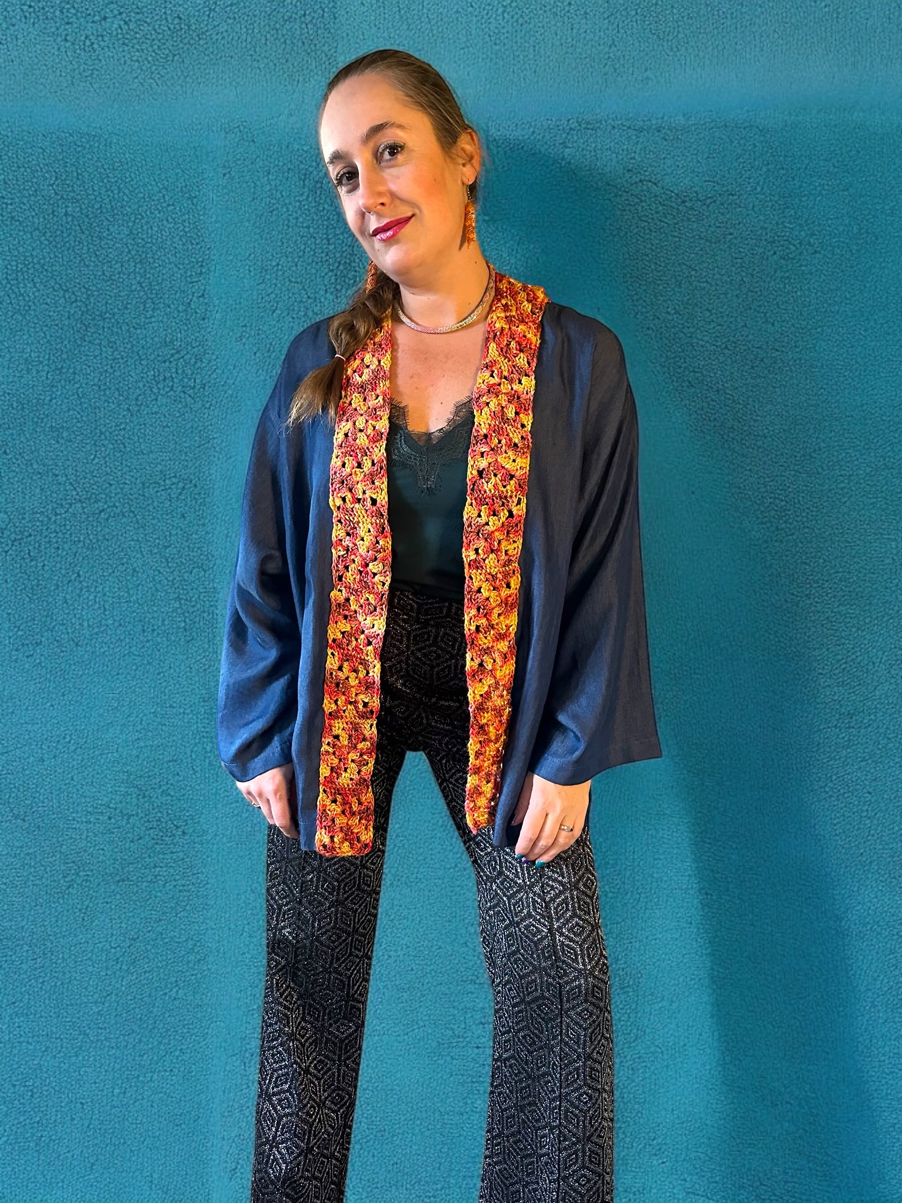 Deze duurzame en milieubewuste kimono combineert stijl en comfort. Gemaakt van zachte Tencel jeans stof en afgewerkt met een gehaakt revers van 100% zeewier garen in zonsopgangkleuren. Super uniek en handgemaakt item dat geschikt is voor maat 36 t/m 50 dankzij de flexibele pasvorm.