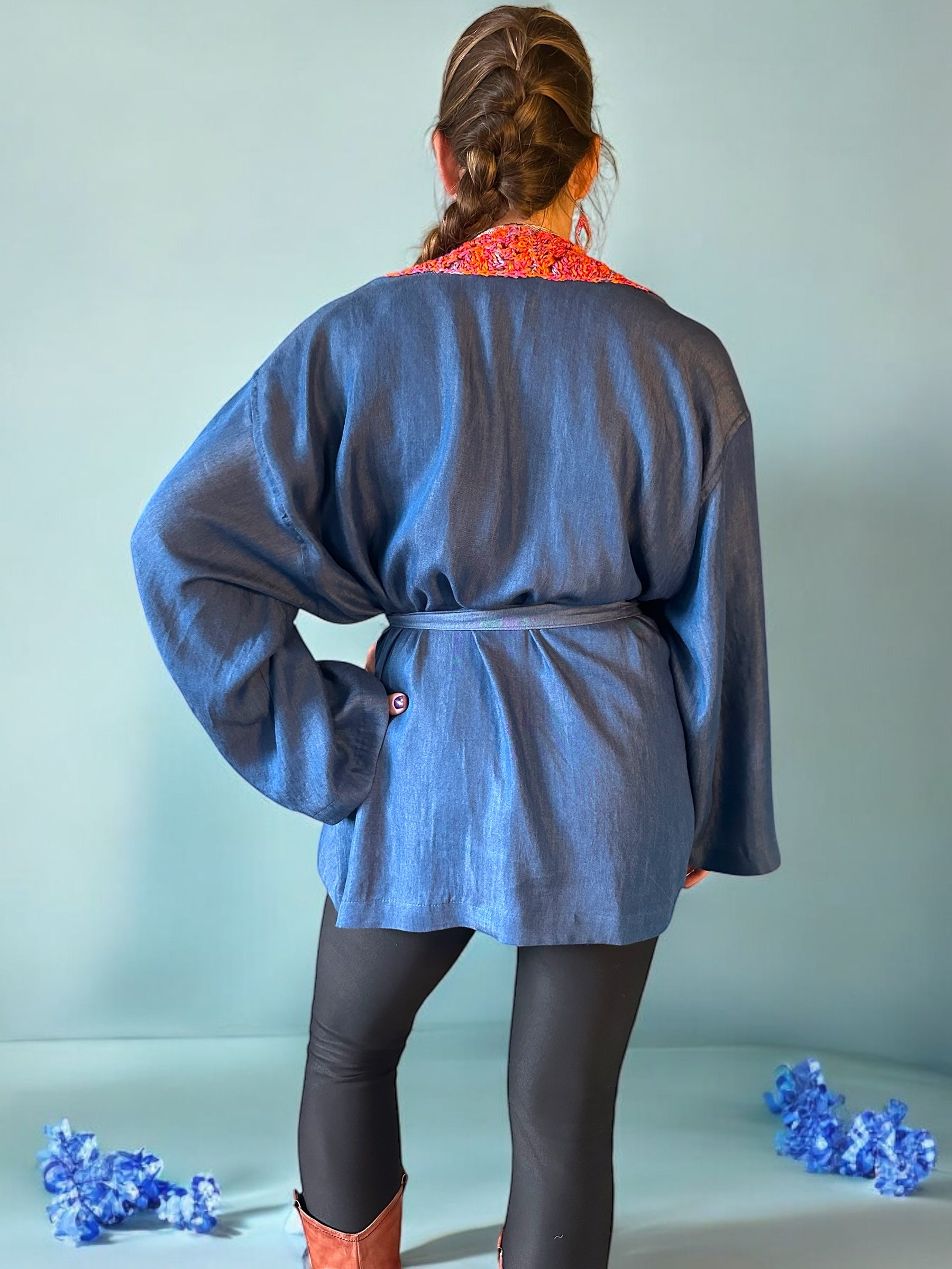 Handgemaakte kimono van Tencel jeans met gehaakte zeewier garen granny squares revers