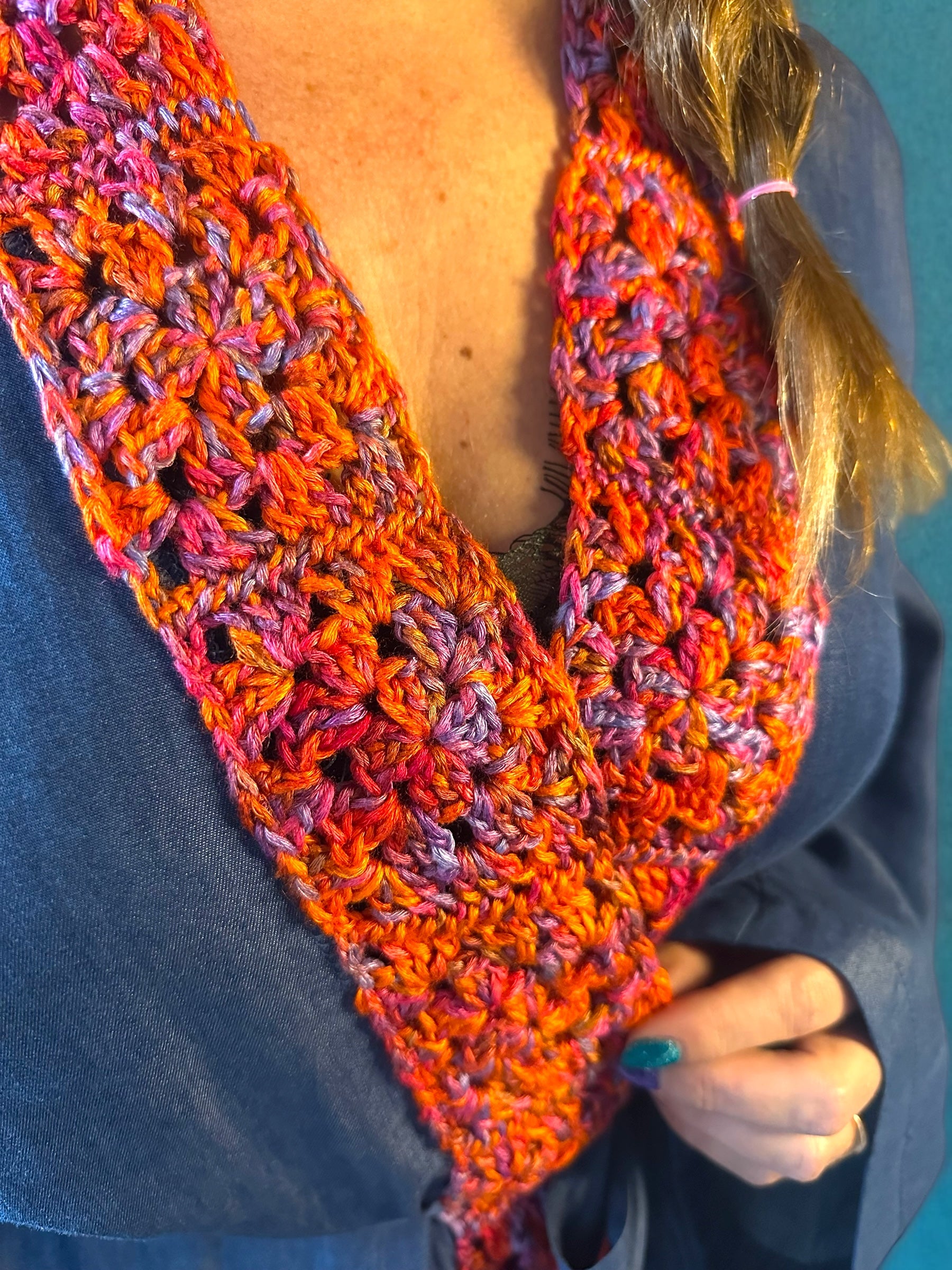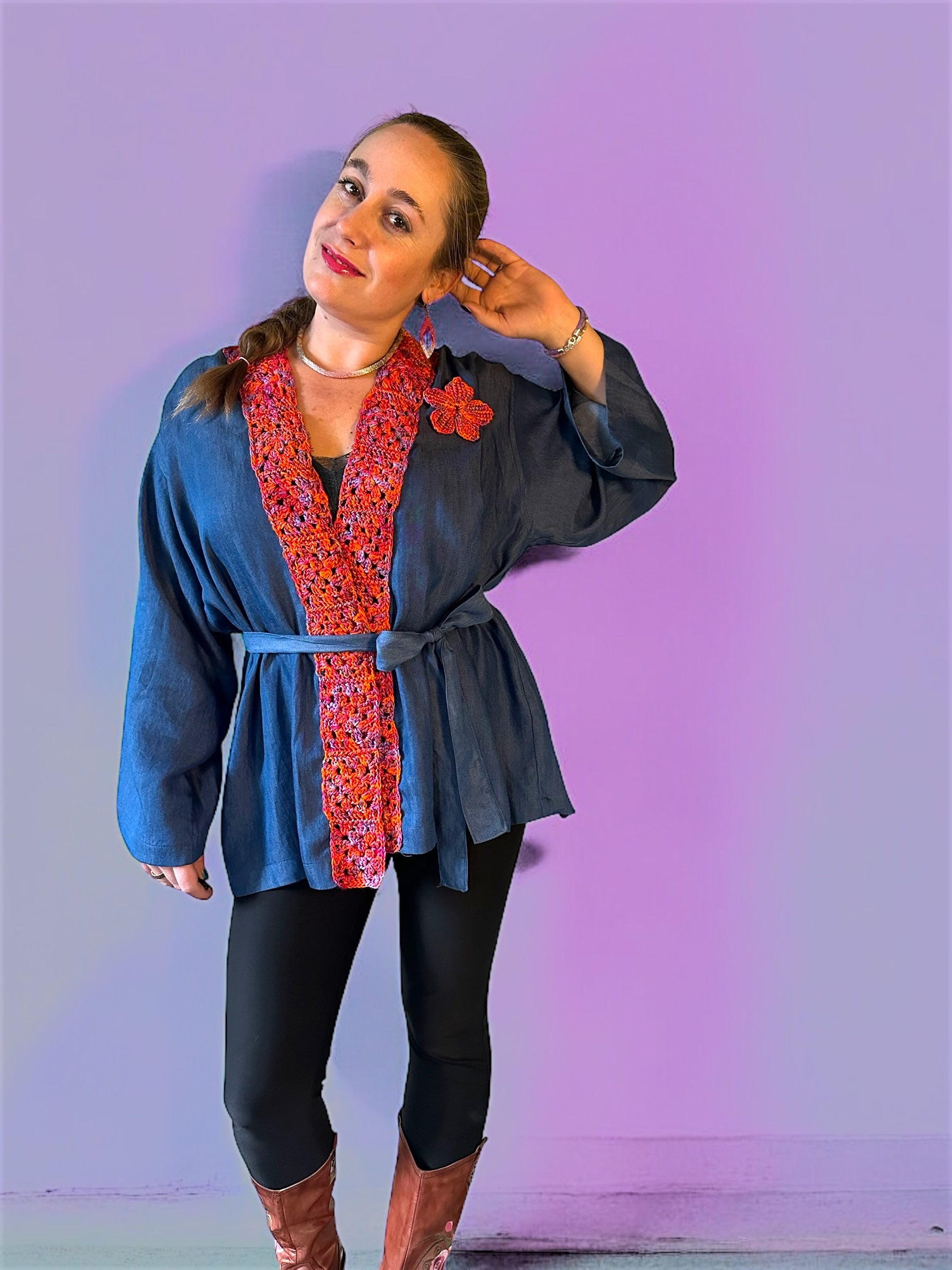 Deze duurzame en milieubewuste kimono combineert stijl en comfort. Gemaakt van zachte Tencel jeans stof en afgewerkt met een gehaakt revers van 100% zeewier garen in zonsondergangkleuren. Een uniek en handgemaakt item dat geschikt is voor maat 36 t/m 52 dankzij de flexibele pasvorm.