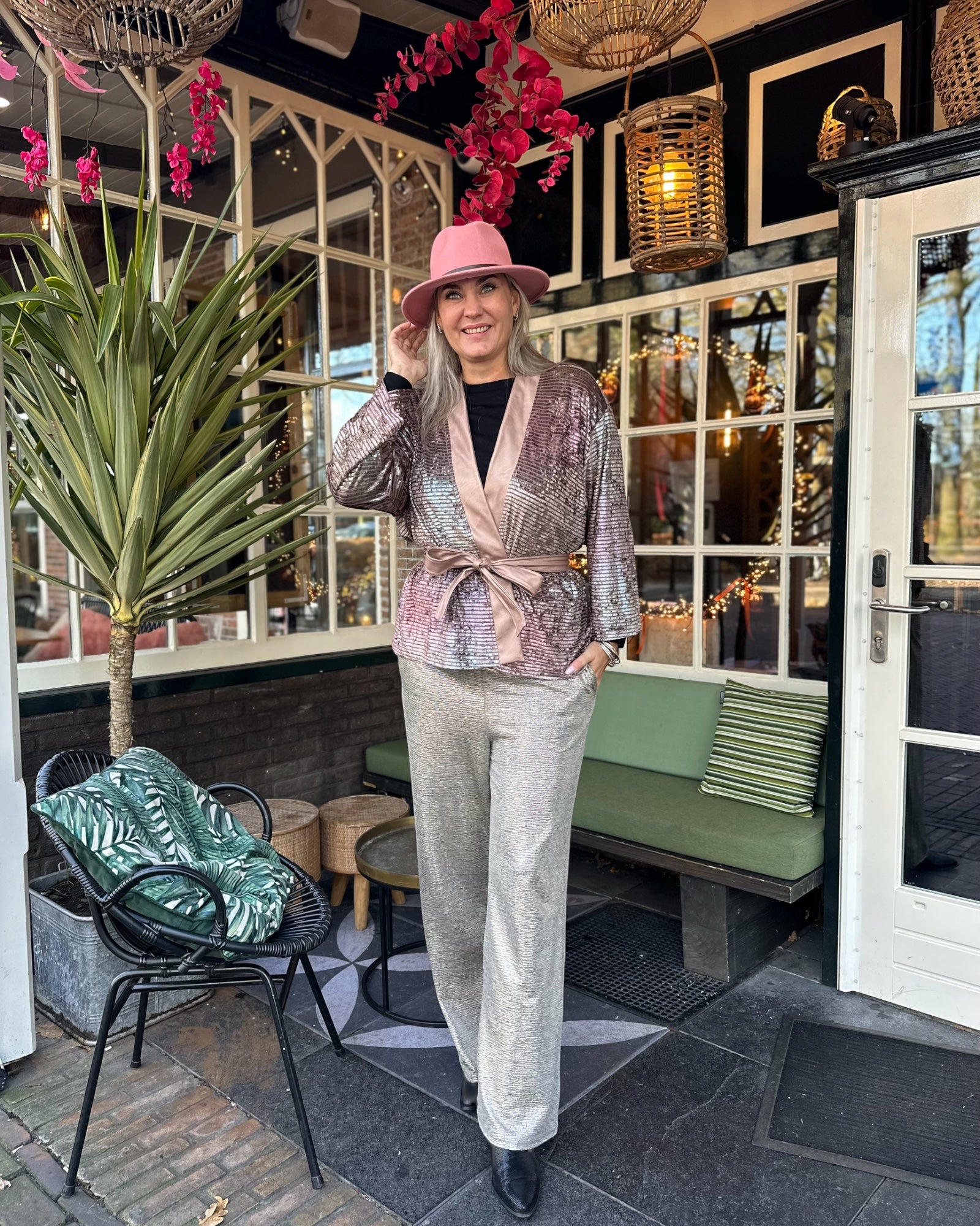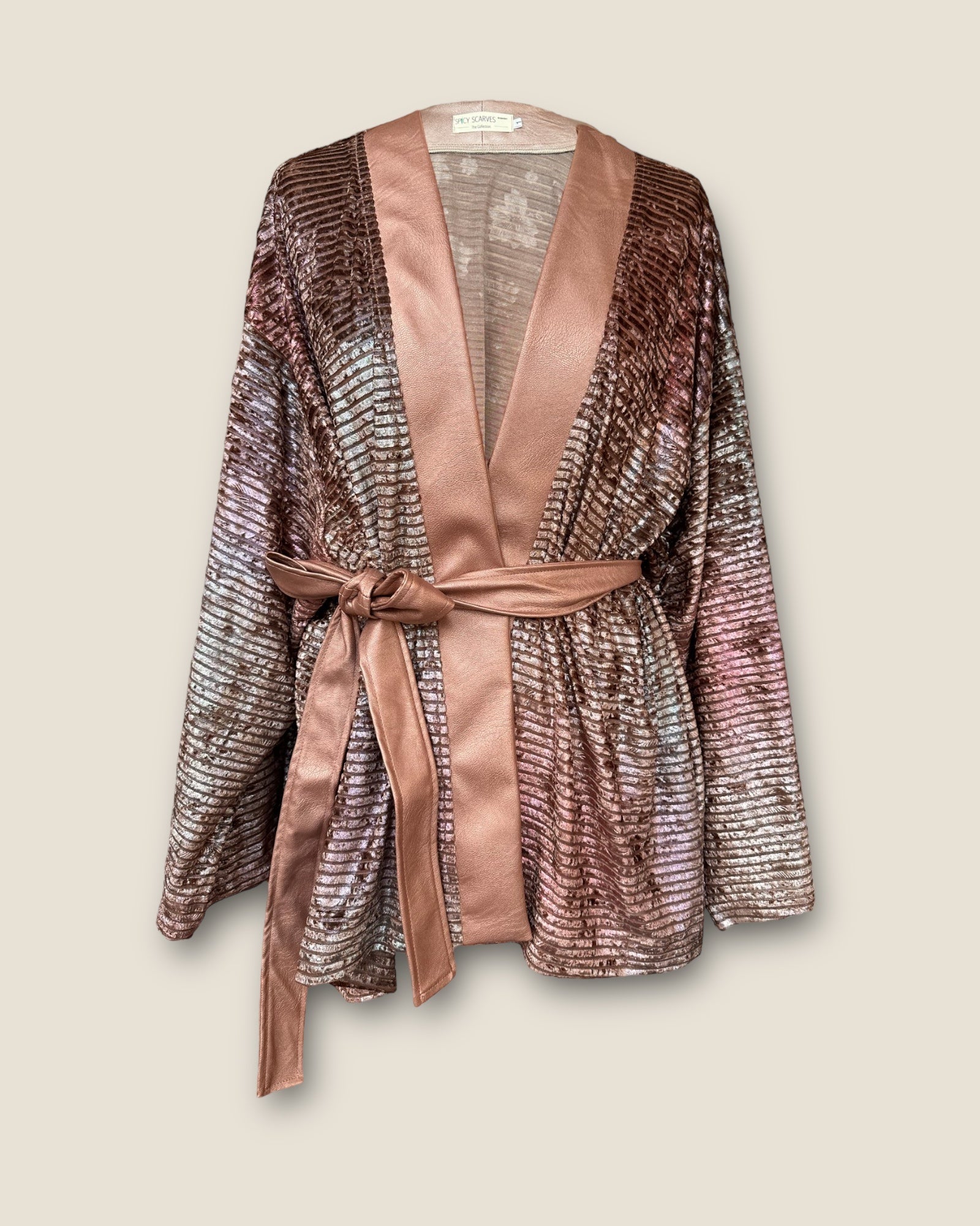 The soft old pink tones combined with the eco leather in metallic rosé give this kimono an elegant and chic look. Whether you're celebrating a special occasion or want to wrap yourself in luxury every day, this kimono is the perfect choice.
