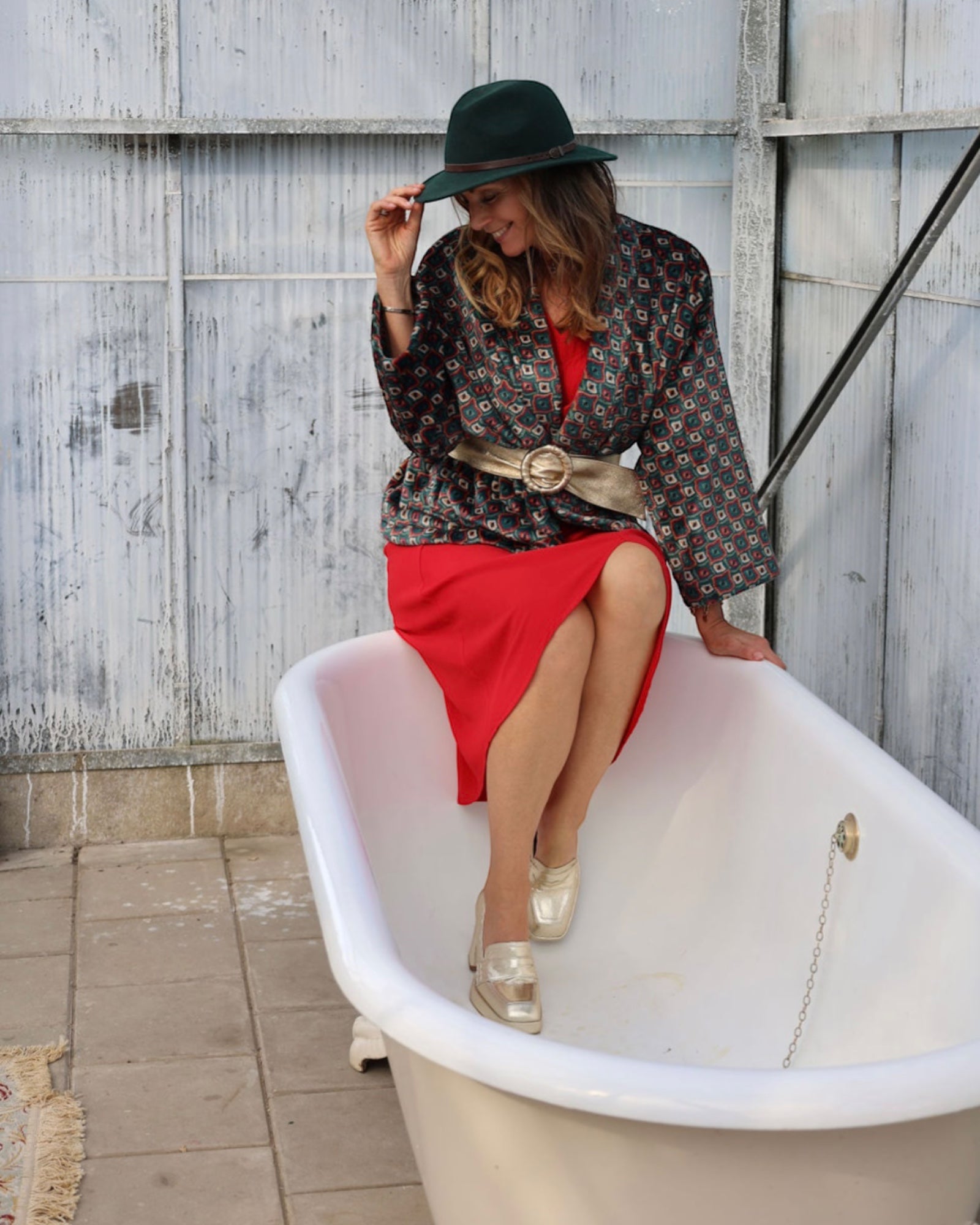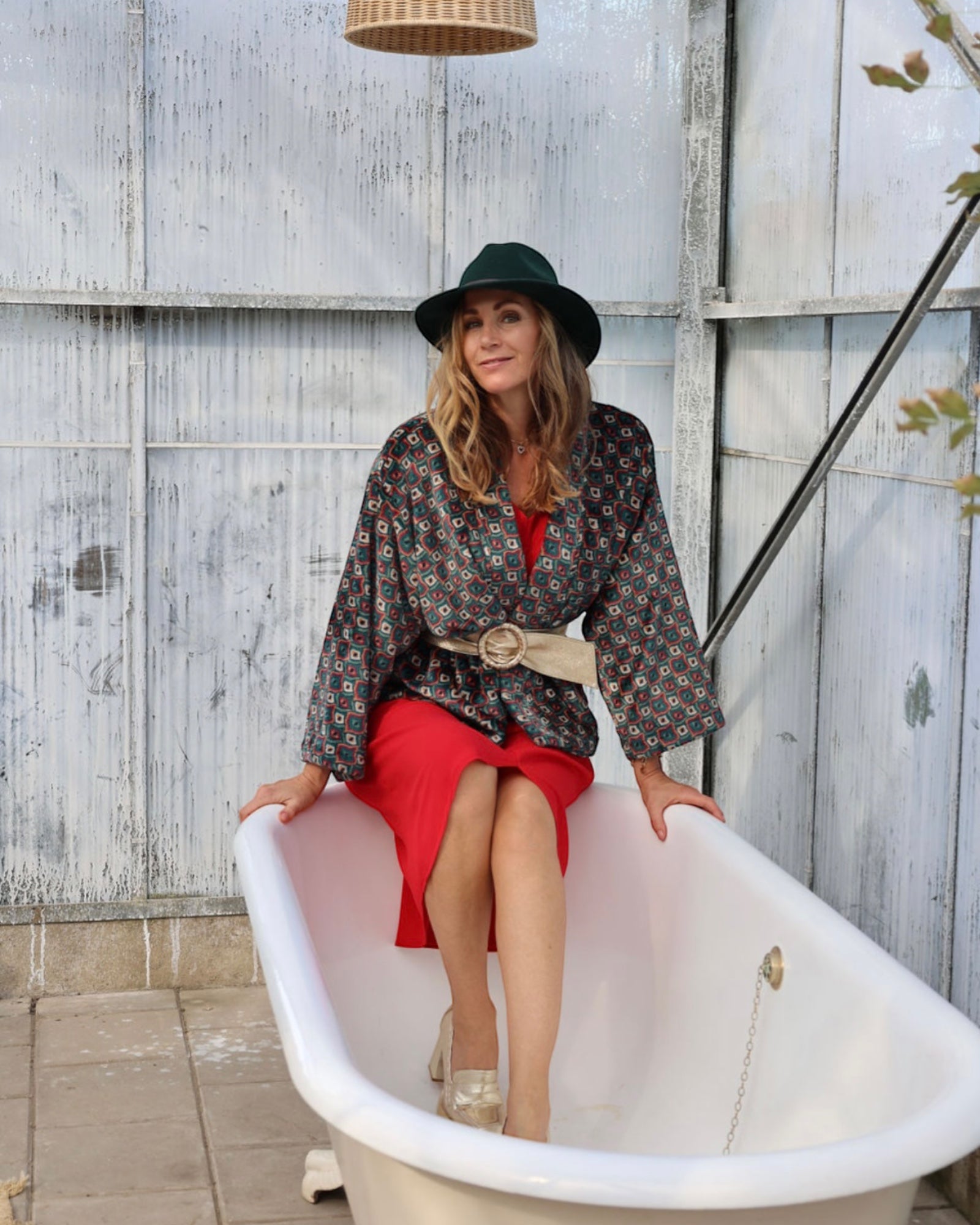 The Cuddle Squares kimono jacket is available in 3 sizes (size 34 – 36, size 38 – 44 and size 46-50) and is wonderfully airy to wear, even on warm days.