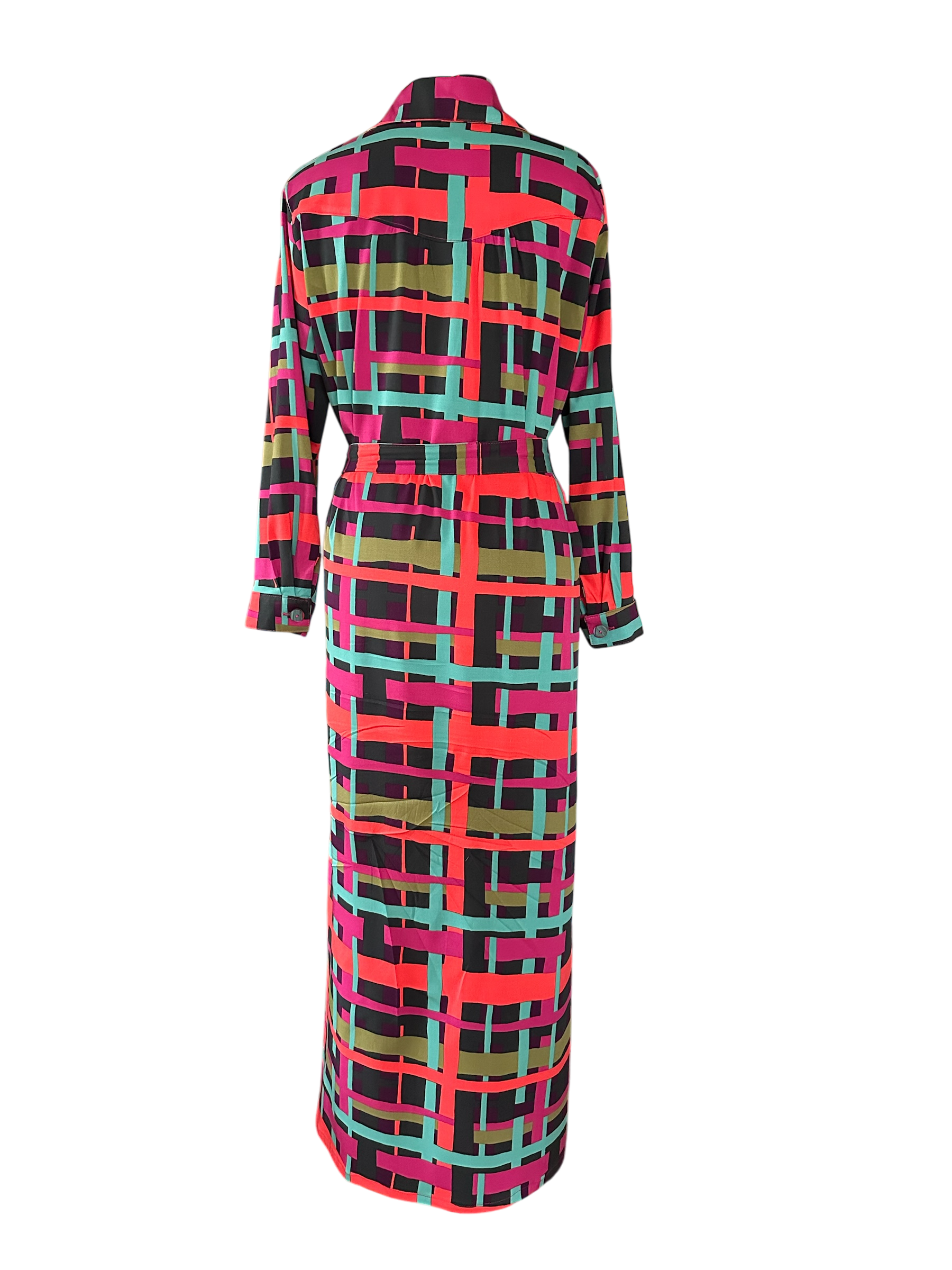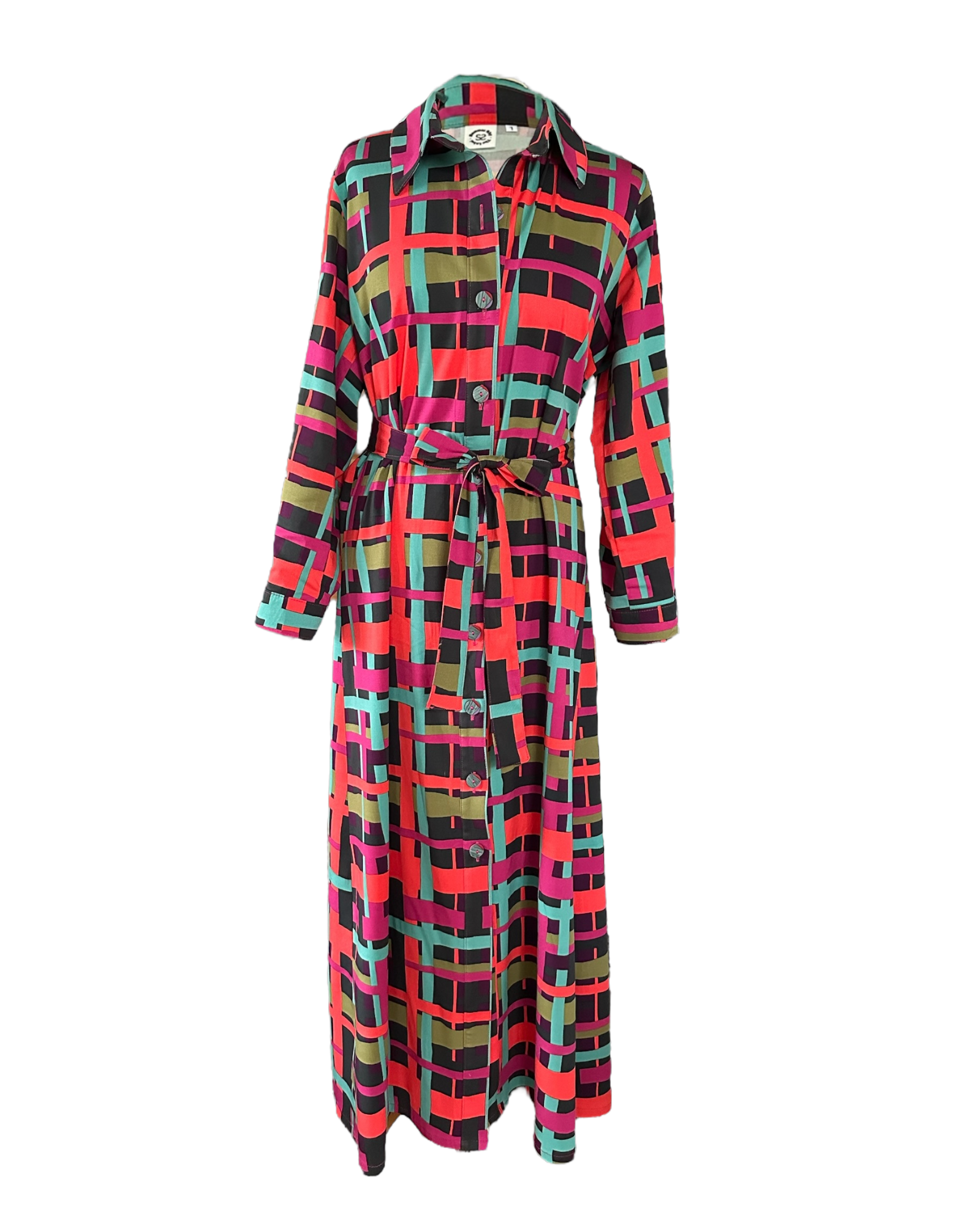 Op zoek naar een echte eyecatcher die comfortabel én duurzaam is? De Jade Dress heeft het allemaal! Deze lange blouse jurk van hoogwaardige, licht elastische viscose stof is een must-have voor iedereen die houdt van kleurrijke kleding. De jurk combineert een speelse print van horizontale en verticale strepen in fuchsia, turquoise, jade, zwart en rood/oranje. Met het bijgeleverde ceintuur kun je je taille accentueren of de jurk juist lekker los dragen. Veelzijdigheid is hier het sleutelwoord!