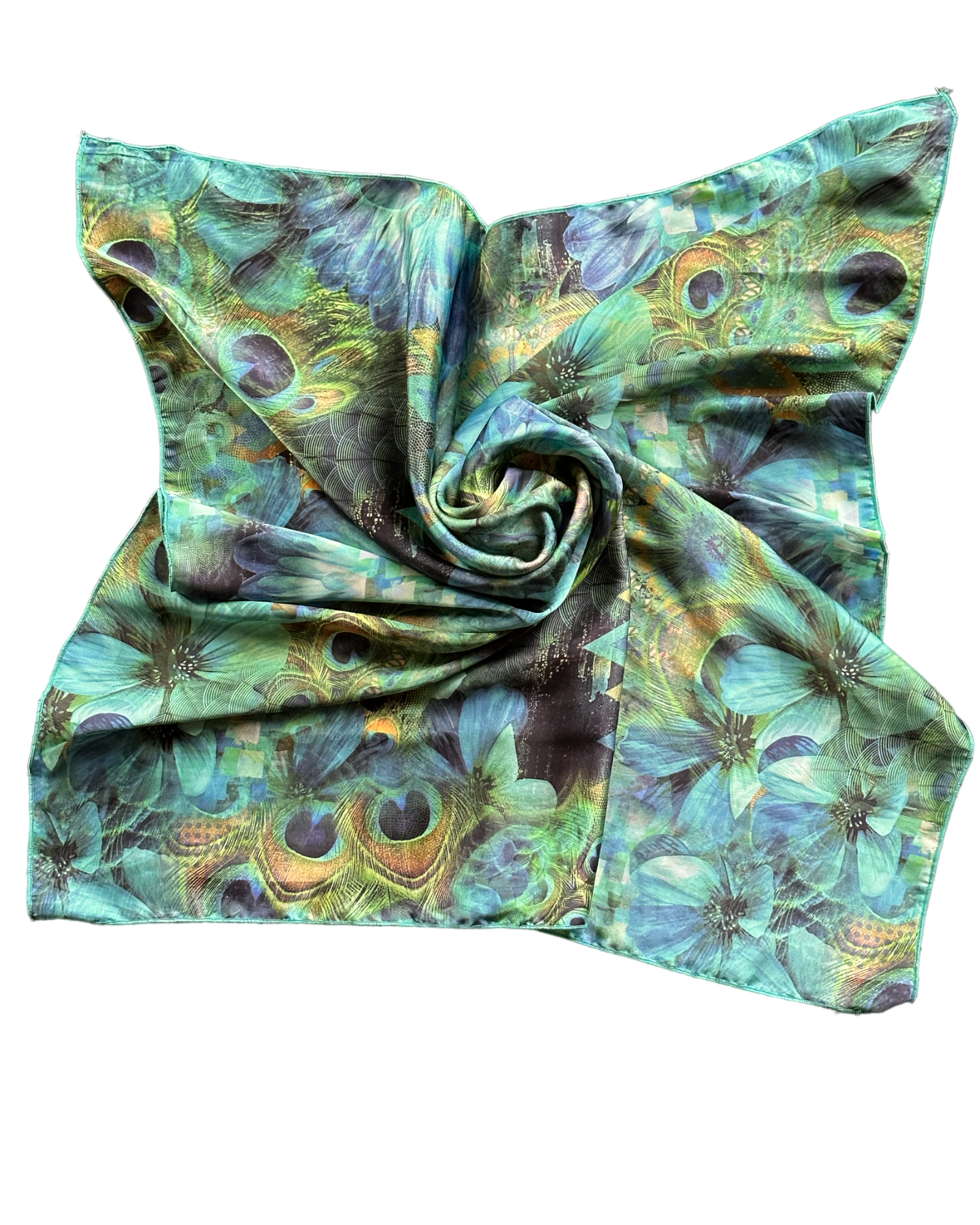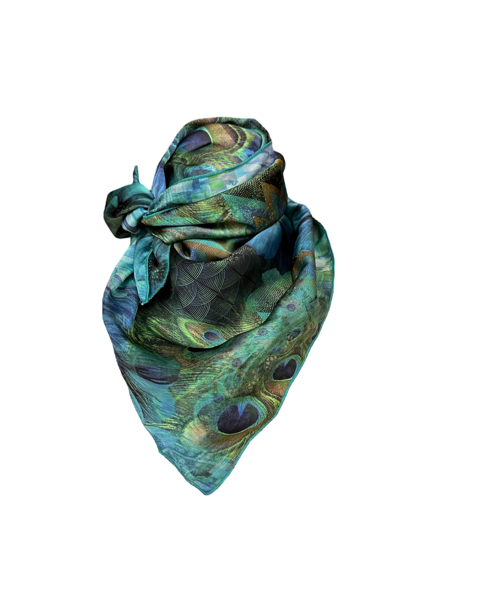 Experience the versatile charm of our Scarfy -Fiery Peahen, a 70x70 cm scarf inspired by the beautiful peacock feather. The colors from the Fiery Peahen palette not only add a touch of glamor to any outfit, but also offer endless possibilities for creativity. Wear it in different ways: as a stylish accessory, a unique headwear, a graceful belt or even as an artful addition to your handbag. Discover the perfect balance between style and functionality with our Scarfy -Fiery Peahen!