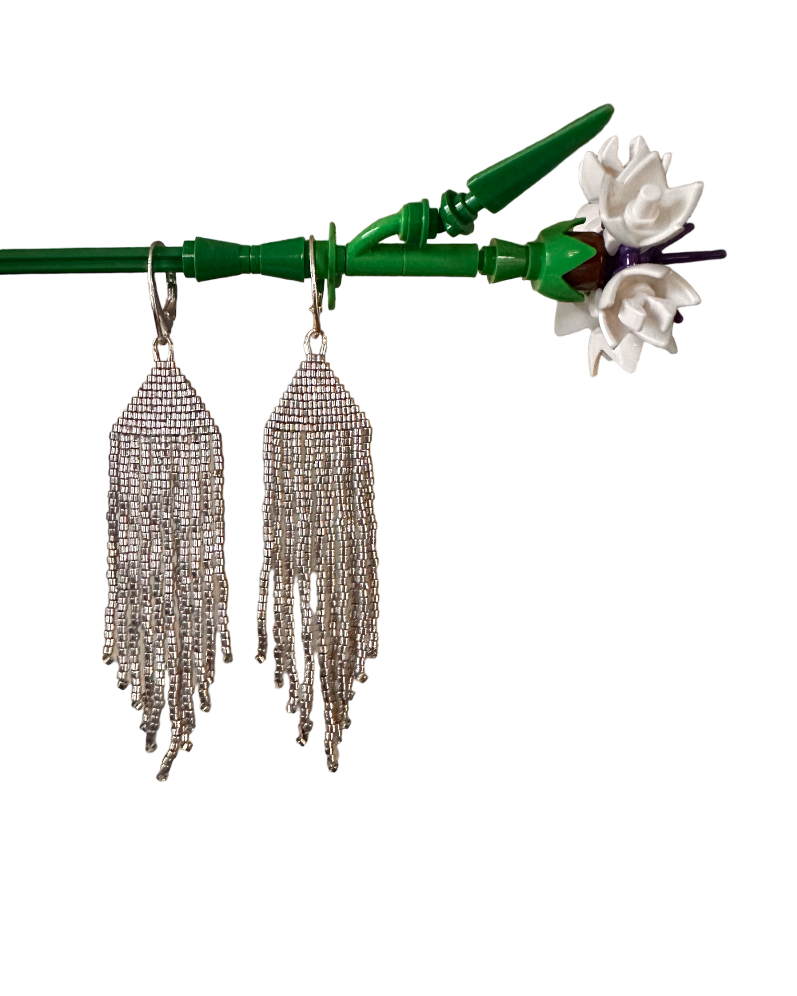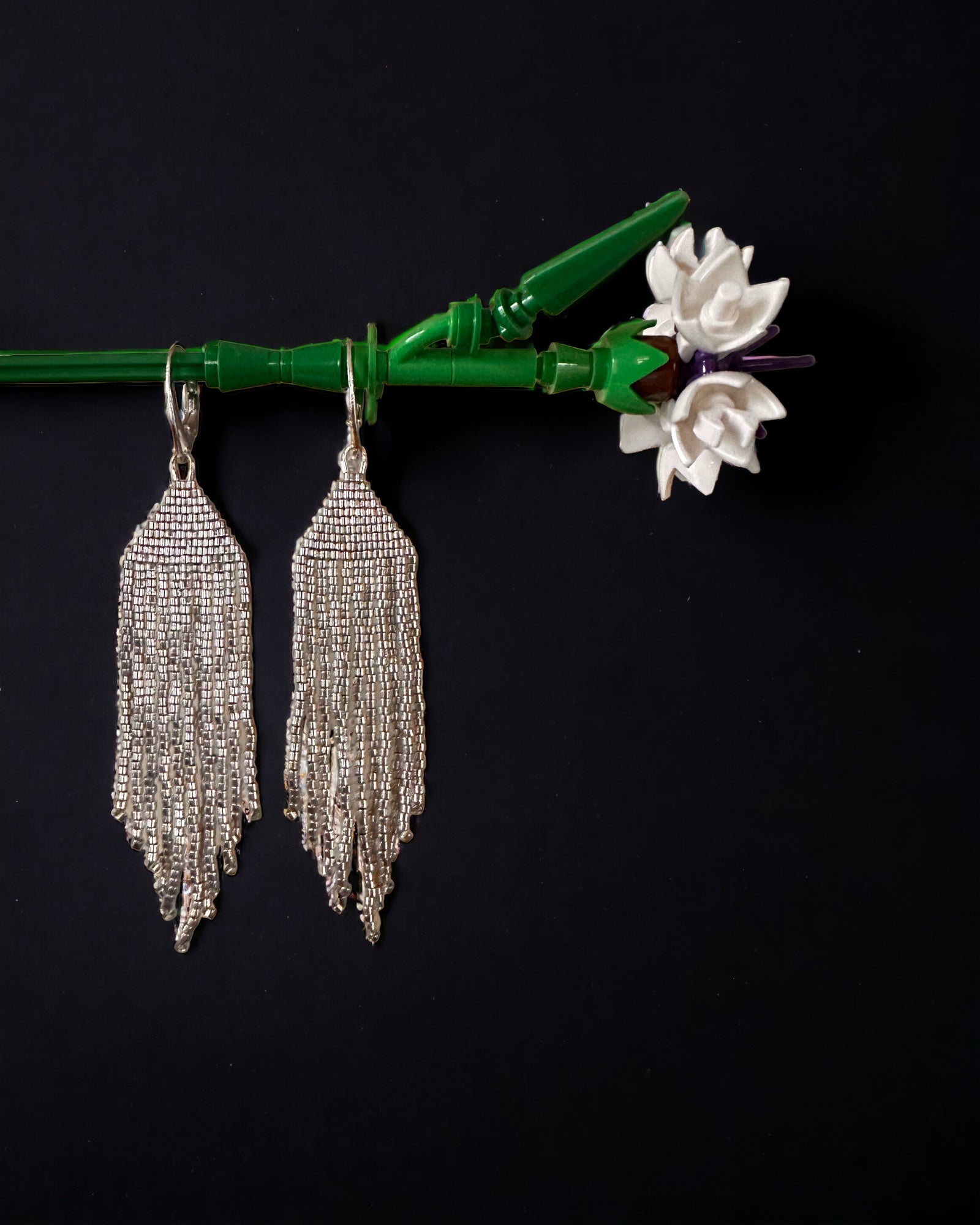 These fringe earrings are made entirely of 925 silver-plated glass beads and feature a 925 silver leverback.