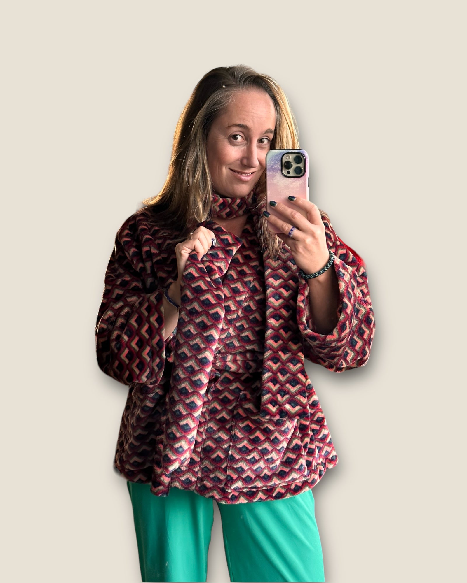 Of je haar nu nonchalant om je nek slaat, creatief knoopt of casual over je schouders drapeert, de Cozy Cuddles sjaal tilt elke outfit naar een hoger niveau. Bonuspunten: hij matcht perfect met het kimono jacket Cuddle Waves en Cuddle Squares. Match made in heaven!