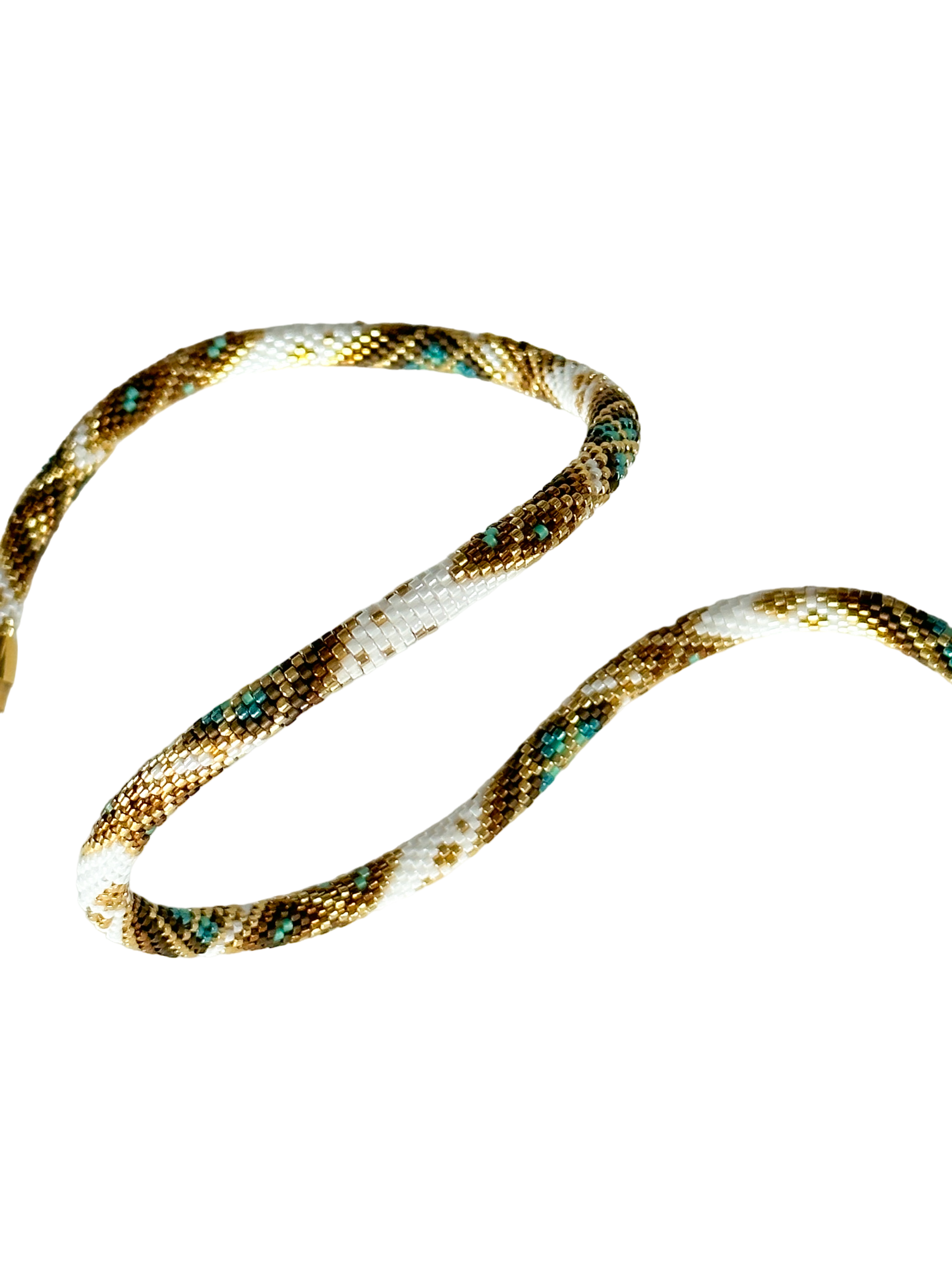 This special necklace shines at you! The sea blue/green delica's provide a subtle color touch. She is a real eye catcher with an intriguing pattern.