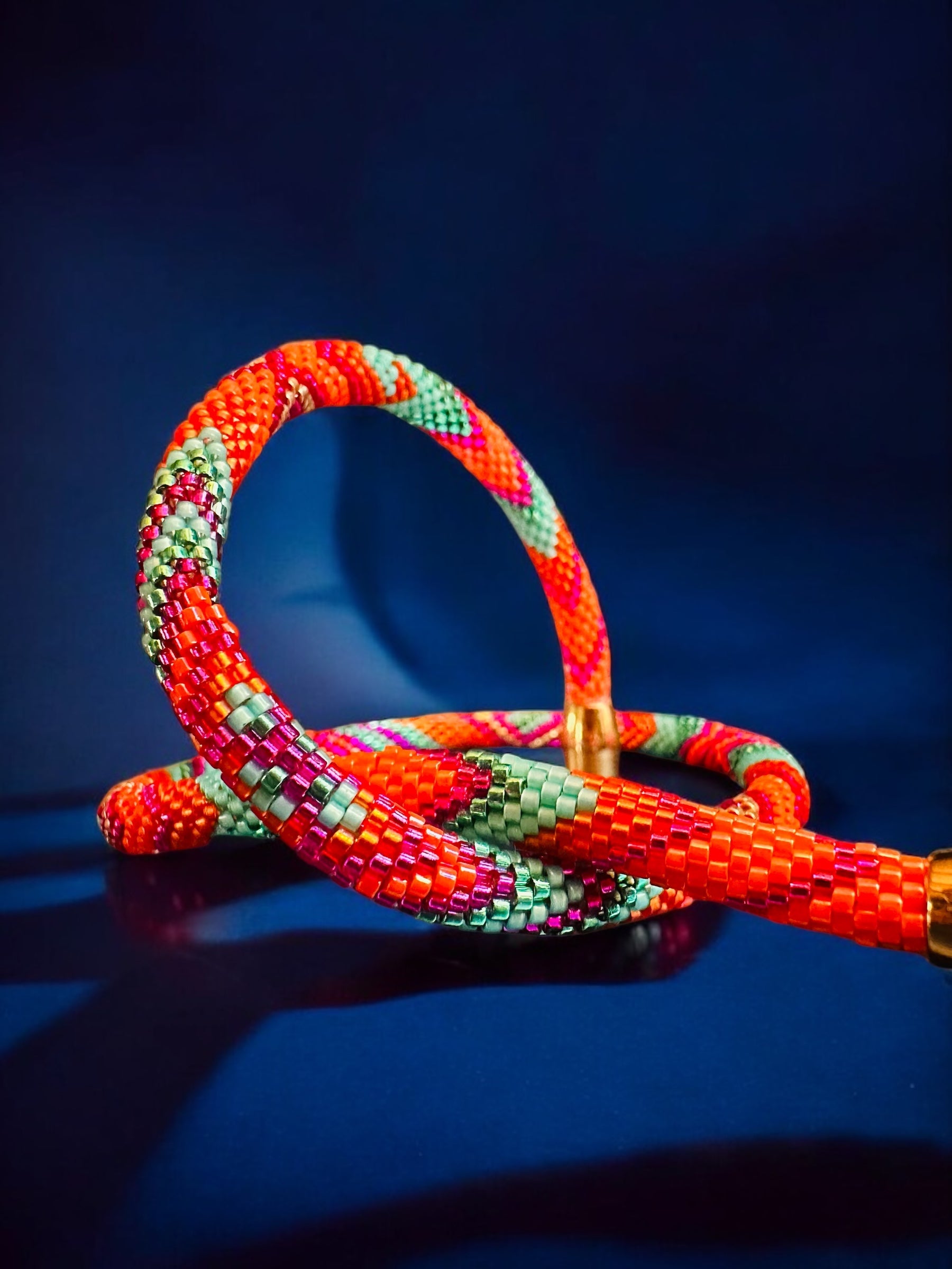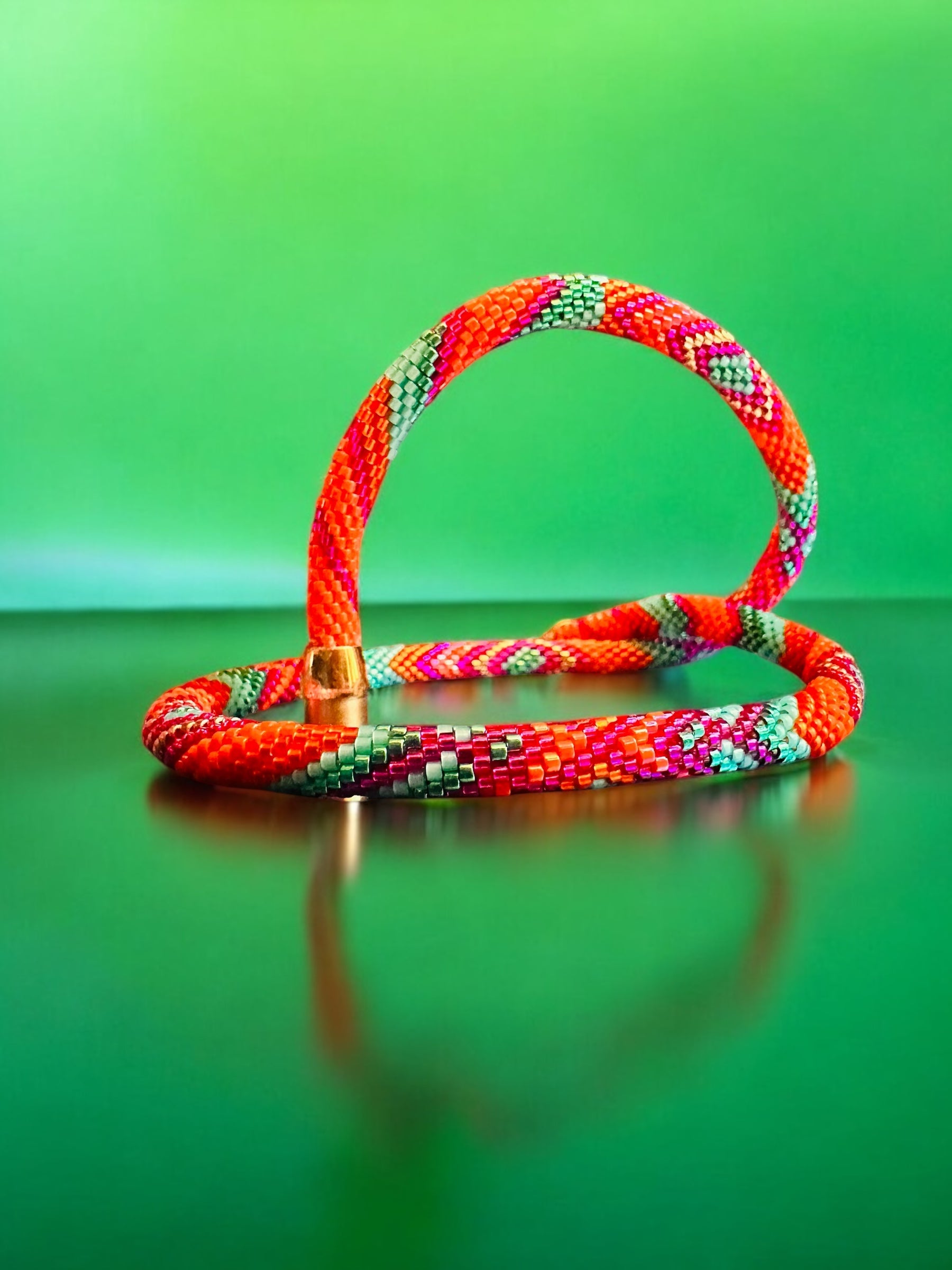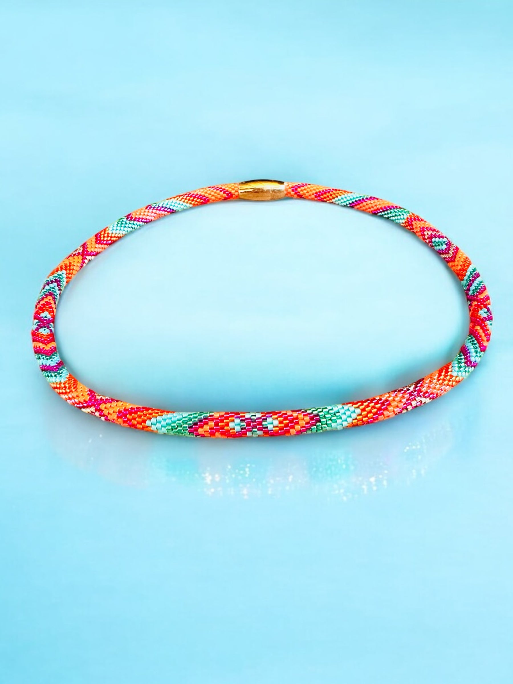 Deze handgemaakte ketting combineert prachtige roze, oranje en groene tinten met een intrigerend patroon dat je keer op keer blijft fascineren. Heb je haar eenmaal om, dan wil je nooit meer zonder!