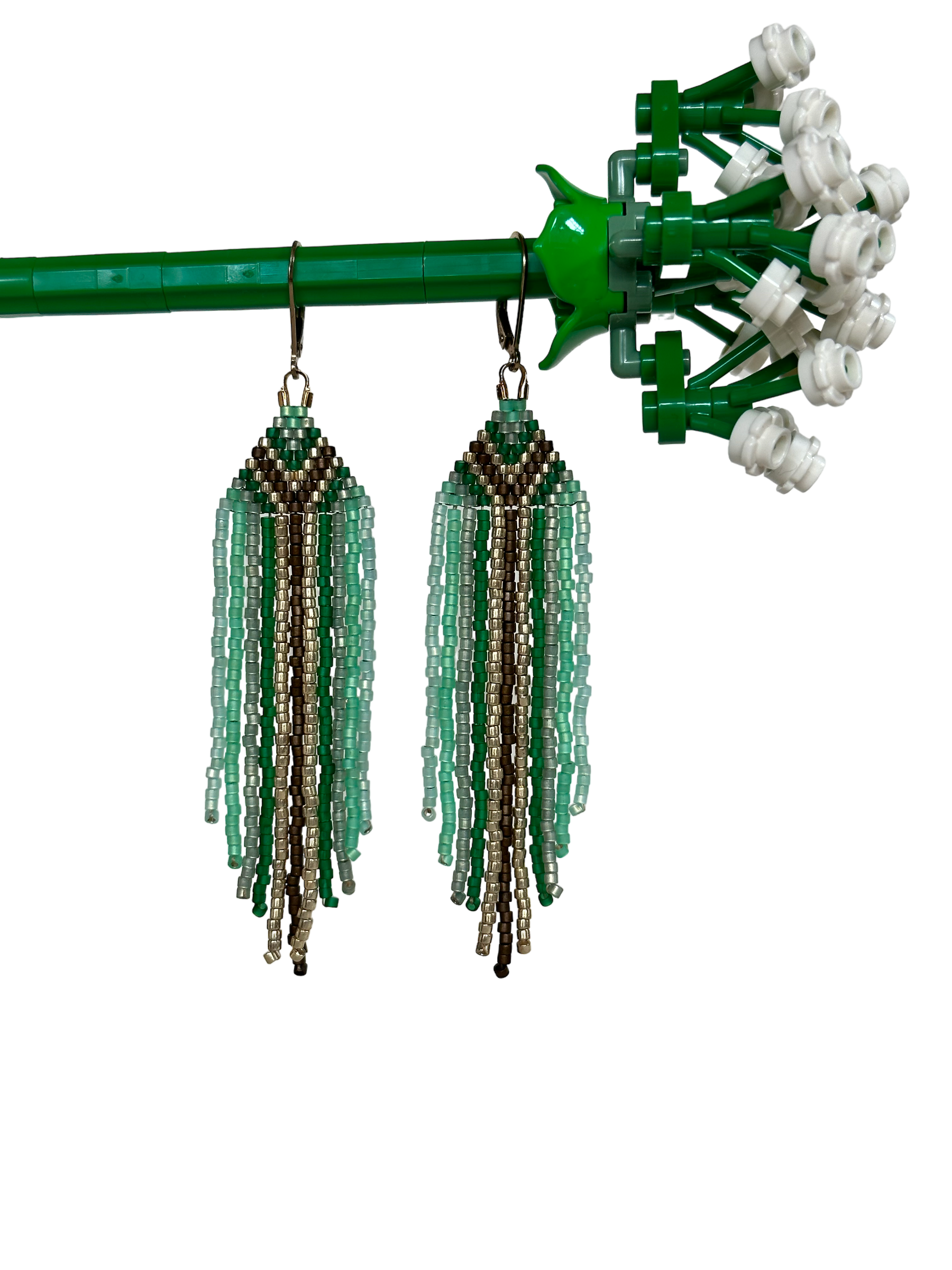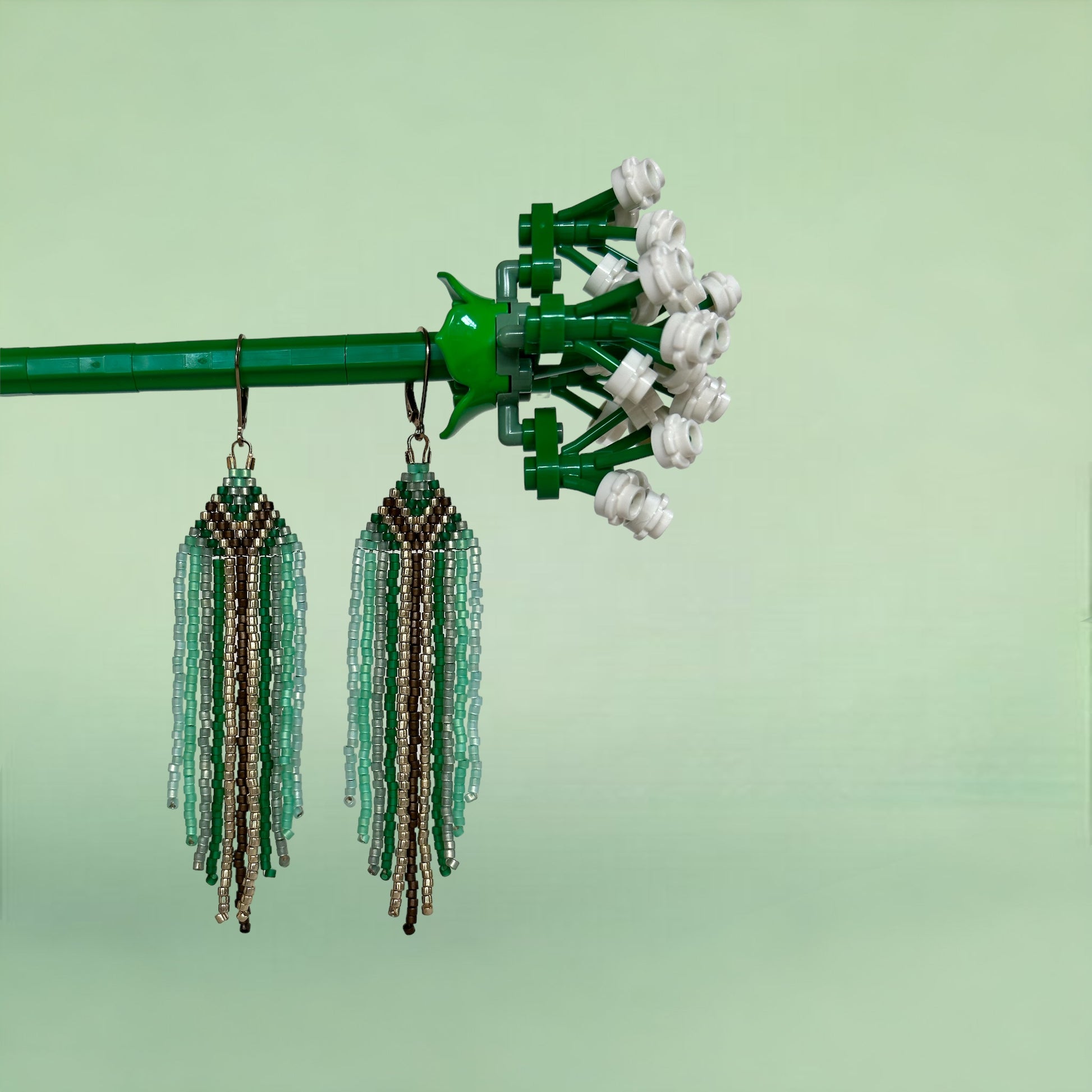 Deze fringe oorbellen hebben een mooi kleurstelling van groenen tinten met goud en mat brons .